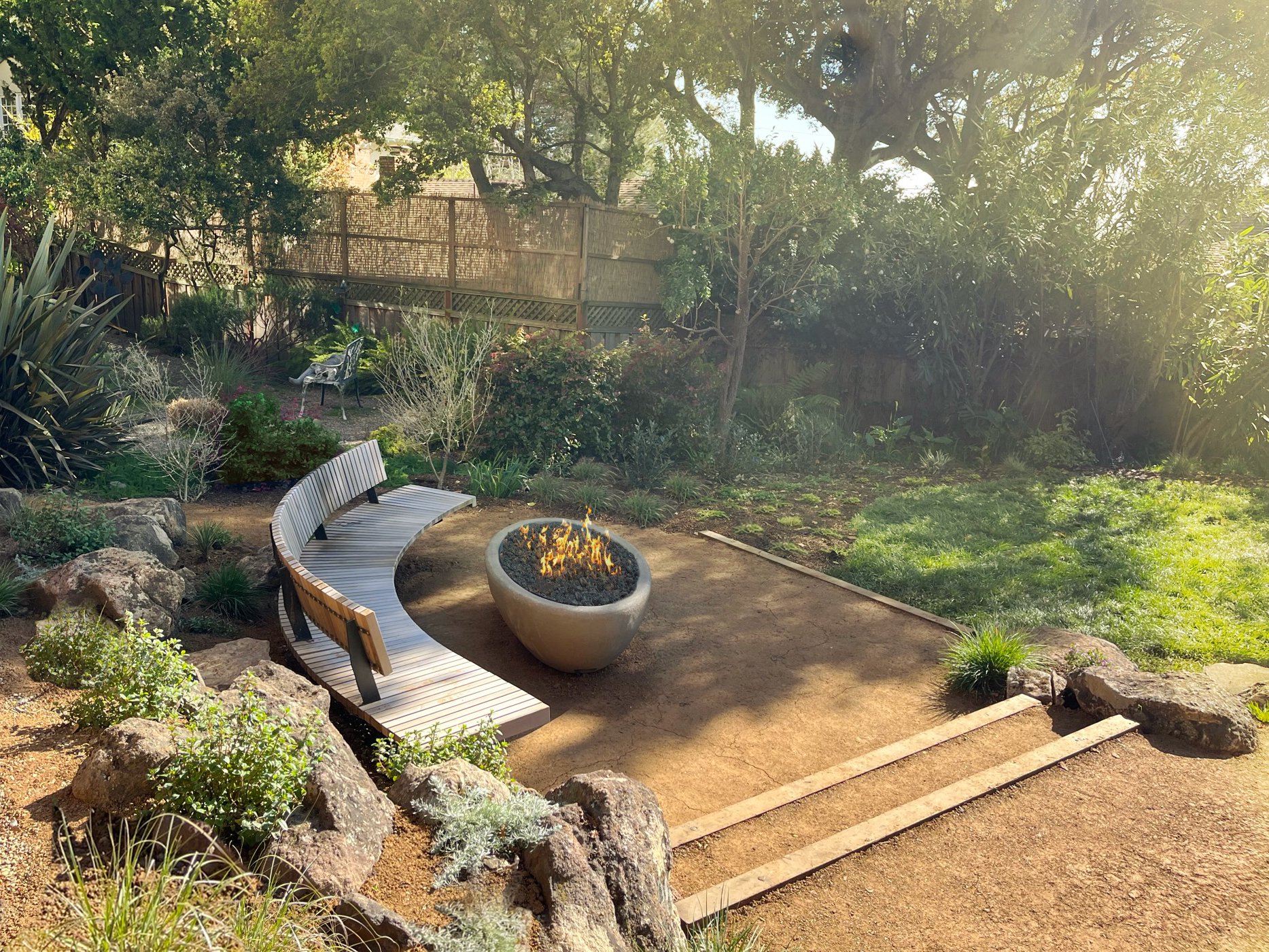 a new garden in three acts—act i, redwood grove to the north. act ii, the lower heart of fresh curved benches holding the garden-to-table dining terrace, lawn, and fireside lounge. act iii, a subtropical staircase below the long-necked palm trees to the south.